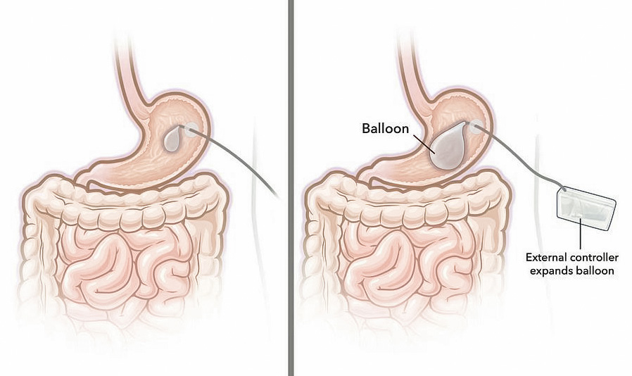 gastric balloons, the new design is a silicone balloon filled with air or saline and placed inside the stomach. Both encourage weight loss by giving people a