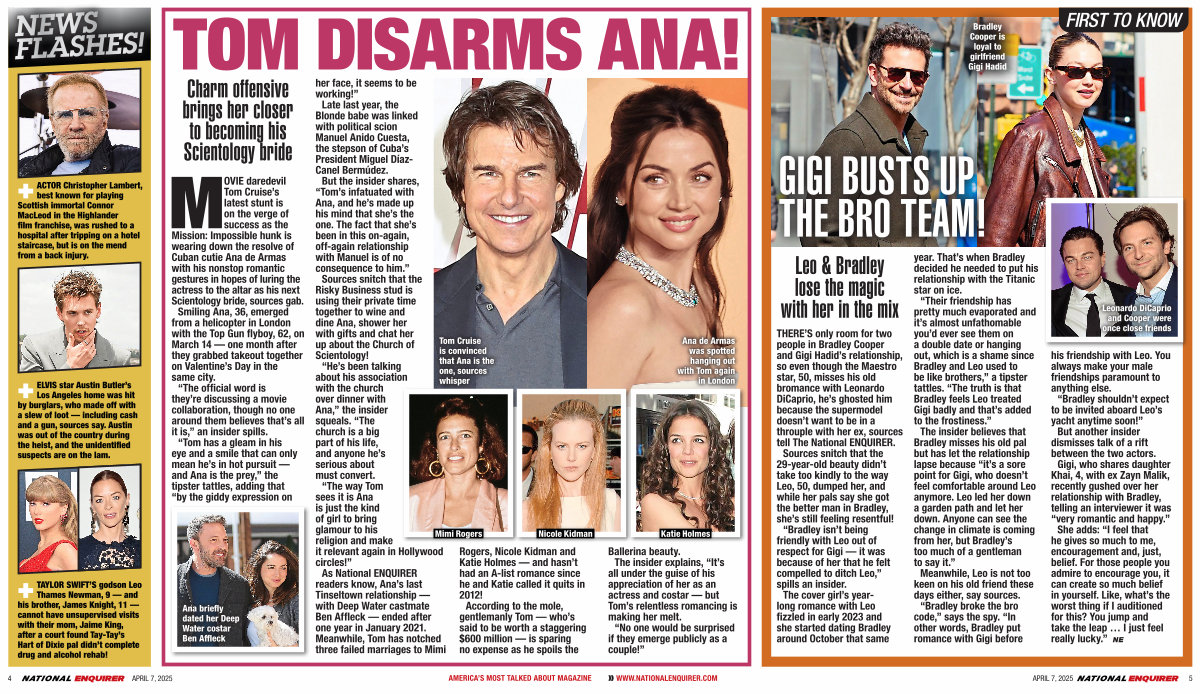 Ana briefly dated her Deep Water costar Ben Affleck her face, it seems to be working!” Late last year, the Blonde babe was linked with political scion Manuel Anido Cuesta, the stepson of Cuba’s President Miguel Díaz- Canel Bermúdez. But the insider shares, “Tom’s infatuated with Ana, and he’s made up his mind that she’s the one. The fact that she’s been in this on-again, off-again relationship with Manuel is of no consequence to him.” Sources snitch that the Risky Business stud is using their private time together to wine and dine Ana, shower her with gifts and chat her up about the Church of Scientology! “He’s been talking about his association with the church over dinner with Ana,” the insider squeals. “The church is a big part of his life, and anyone he’s serious about must convert. “The way Tom sees it is Ana is just the kind of girl to bring glamour to his religion and make it relevant again in Hollywood circles!” As National ENQUIRER readers know, Ana’s last Tinseltown relationship — with Deep Water castmate Ben Affleck — ended after one year in January 2021. Meanwhile, Tom has notched three failed marriages to Mimi