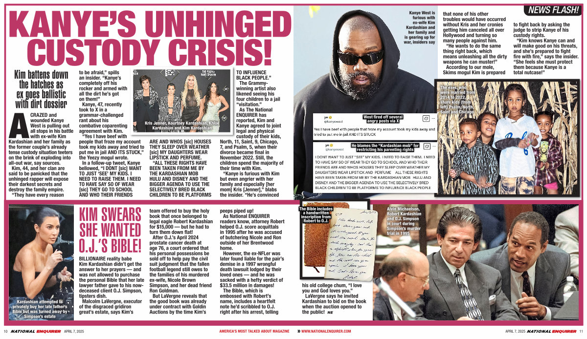 CRAZED and wounded Kanye West is pulling out all stops in his battle with ex-wife Kim Kardashian and her family as the former couple’s already tense custody situation teeters on the brink of exploding into all-out war, say sources. Kim, 44, and her clan are said to be panicked that the unhinged rapper will expose their darkest secrets and destroy the family empire. “They have every reason to be afraid,” spills an insider. “Kanye’s completely off his rocker and armed with all the dirt he’s got on them!” Kanye, 47, recently took to X in a grammar-challenged rant about his combative coparenting agreement with Kim. “Yes I have beef with people that froze my account took my kids away and tried to put me in jail AND ITS STUCK,” the Yeezy mogul wrote. In a follow-up tweet, Kanye bellowed, “I DONT [sic] WANT TO JUST ‘SEE’ MY KIDS. I NEED TO RAISE THEM. I NEED TO HAVE SAY SO OF WEAR [sic] THEY GO TO SCHOOL AND WHO THEIR FRIENDS