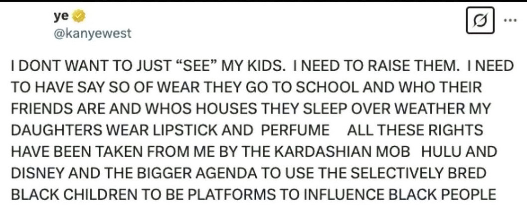 ARE AND WHOS [sic] HOUSES THEY SLEEP OVER WEATHER [sic] MY DAUGHTERS WEAR LIPSTICK AND PERFUME. “ALL THESE RIGHTS HAVE BEEN TAKEN FROM ME BY THE KARDASHIAN MOB HULU AND DISNEY AND THE BIGGER AGENDA TO USE THE SELECTIVELY BRED BLACK CHILDREN TO BE PLATFORMS