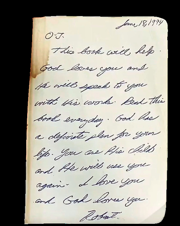 The Bible includes a handwritten inscription from Robert to O.J.