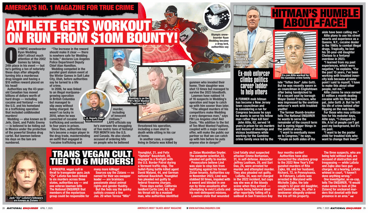 gunmen who invaded their home. Their daughter was shot 13 times but managed to survive the 2023 bloodbath. Lawmen have nabbed 14 of 16 suspects in Wedding’ s operation and hope to catch up with him sooner than later.“ The alleged murders of his competitors make Wedding a very dangerous man,” says FBI Los Angeles chief Akil Davis.“ His addition to the list of Ten Most Wanted Fugitives, coupled with a major reward offer, will make the public our partner so that we can catch up with him before he puts anyone else in danger!” |
